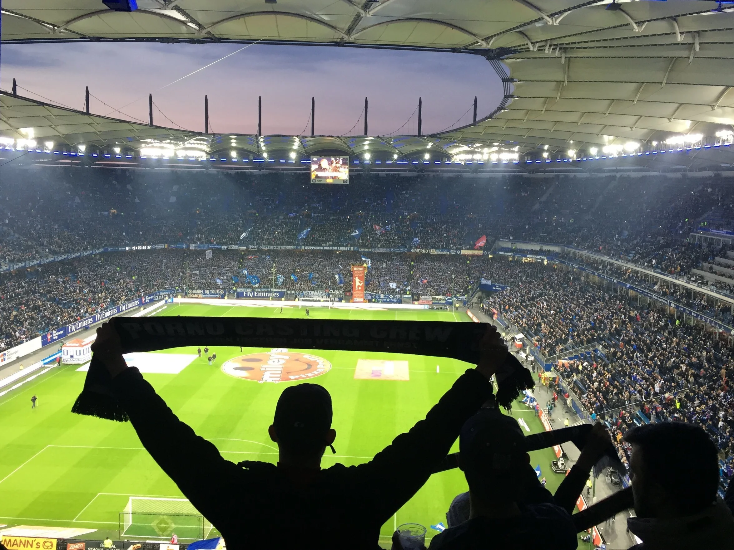 Volksparkstadion som det kunne se ud præ-corona. Her fra en kamp mod Magdeburg i 2. Bundesliga den 8. april 2019, hvor Hamburger Sport-Verein begyndte at smide den første af to tilsyneladende sikre oprykninger væk. Efter at være kommet foran 1-0 tabte HSV 1-2 på et Magdeburg-mål i sidste sekund. Foto: Nicklas Degn.