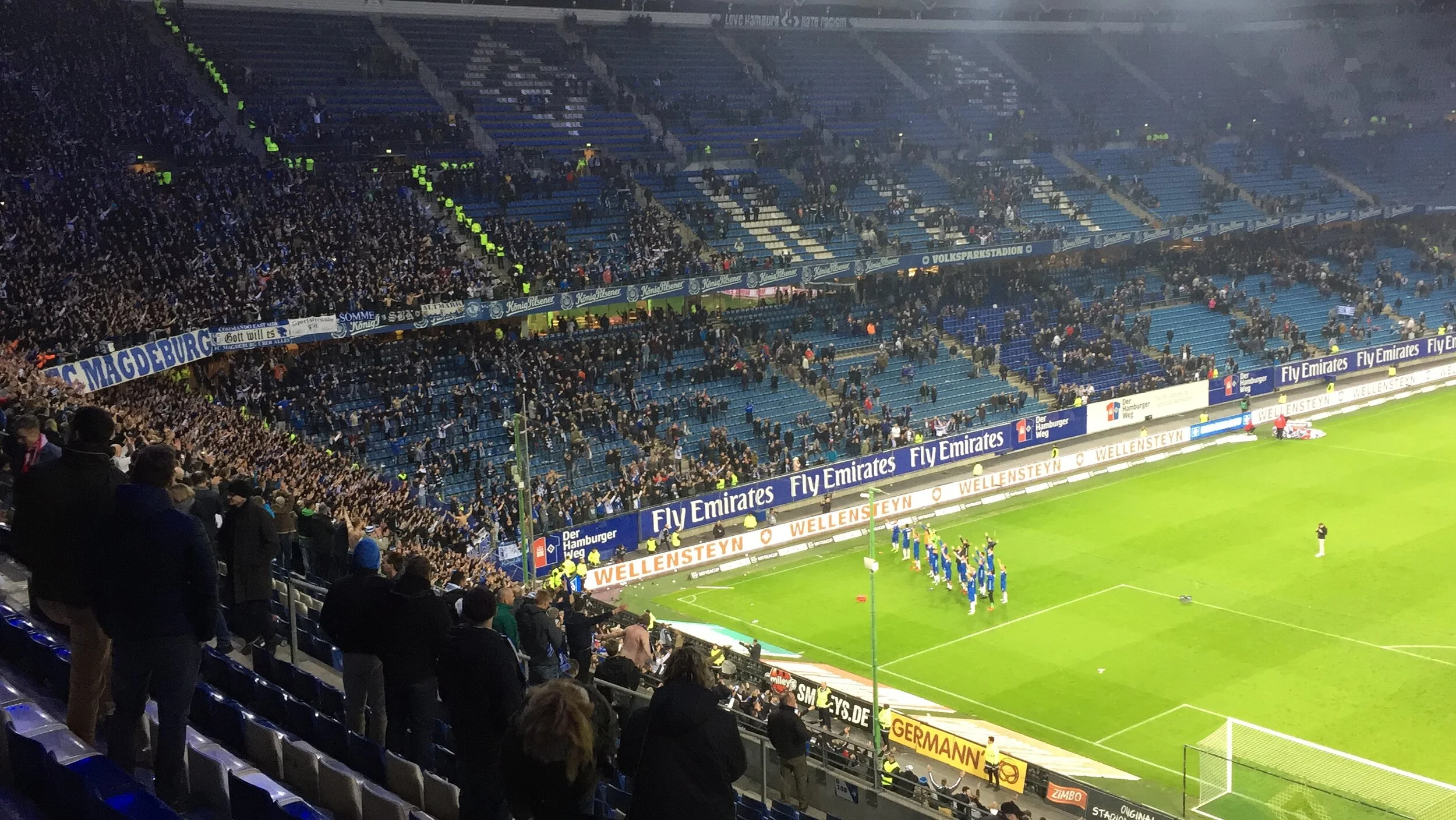 Volksparkstadion tømmes hurtigt, mens Magdeburg-spillerne takker sin medbragte fanfraktion i et hjørne af stadion. Fra kampen mellem HSV og Magdeburg, som Magdeburg vandt 2-1, den 8. april 2018. Foto: Nicklas Degn.